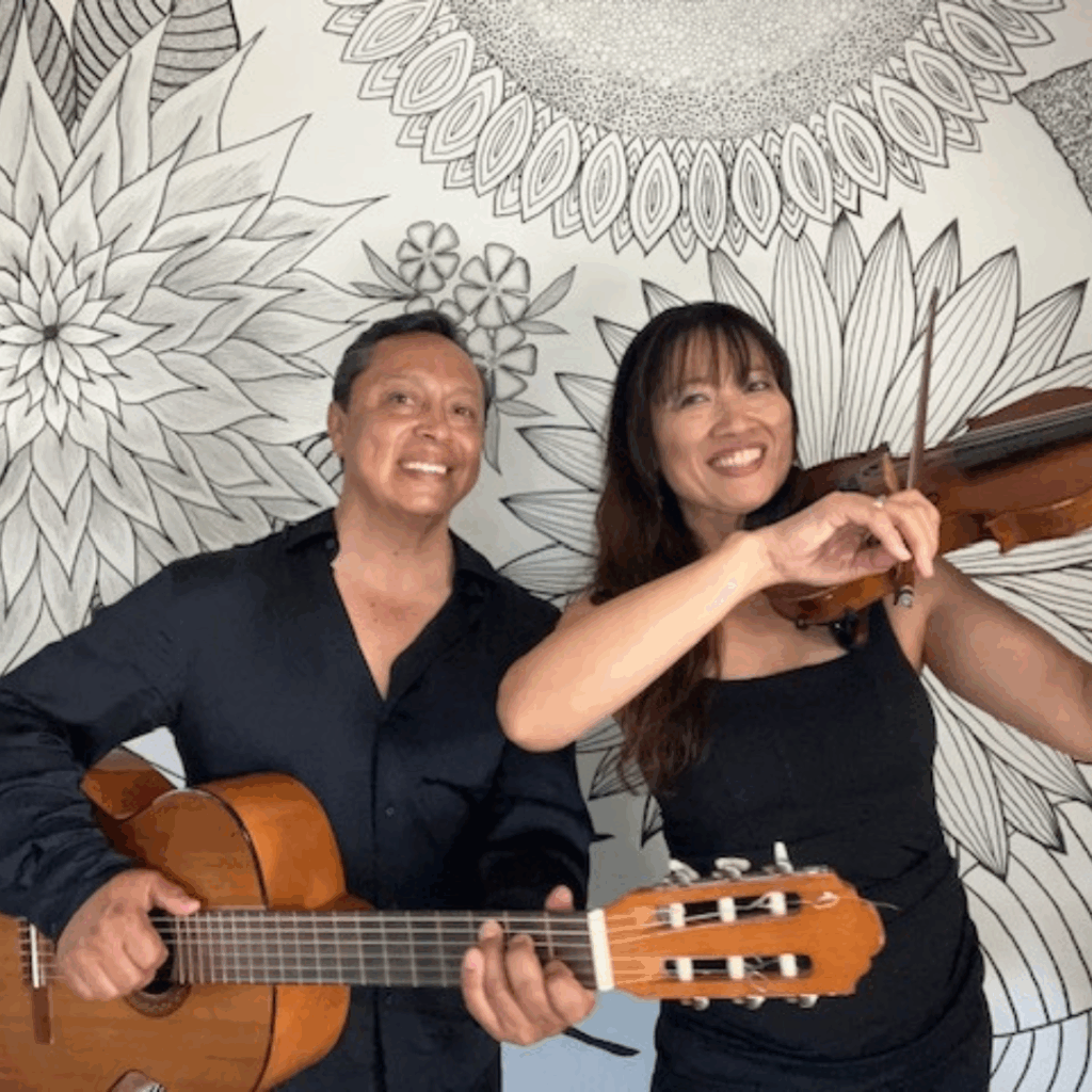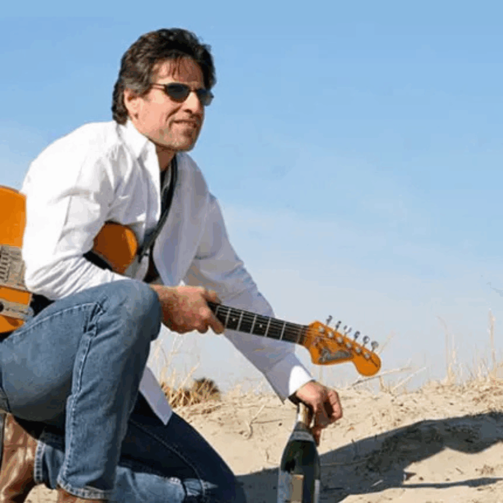 Peter Sears, musician, with guitar in hand looking down and mic is near his face.